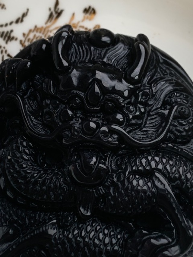 龍(ドラゴン・青龍)の彫刻入り レインボーオブシディアンAAA 穴あきプレート型
