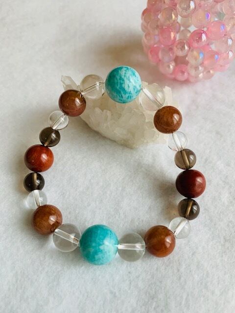とても素敵なブレスレットで見た瞬間から気に入りました。身に付けても穏やかで優しい感じでしっくり落ち着いています。パステルピンクのイメージにアクアマリンがなじんでいてガーネットが効いていてとてもいいです。おしゃれで綺麗なブレスレットに